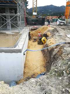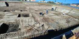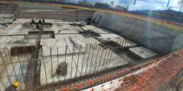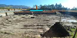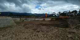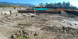 Construcción, cimentación, estructura, plataforma, placas en concreto pulido, relleno perimetrales y muros de contención